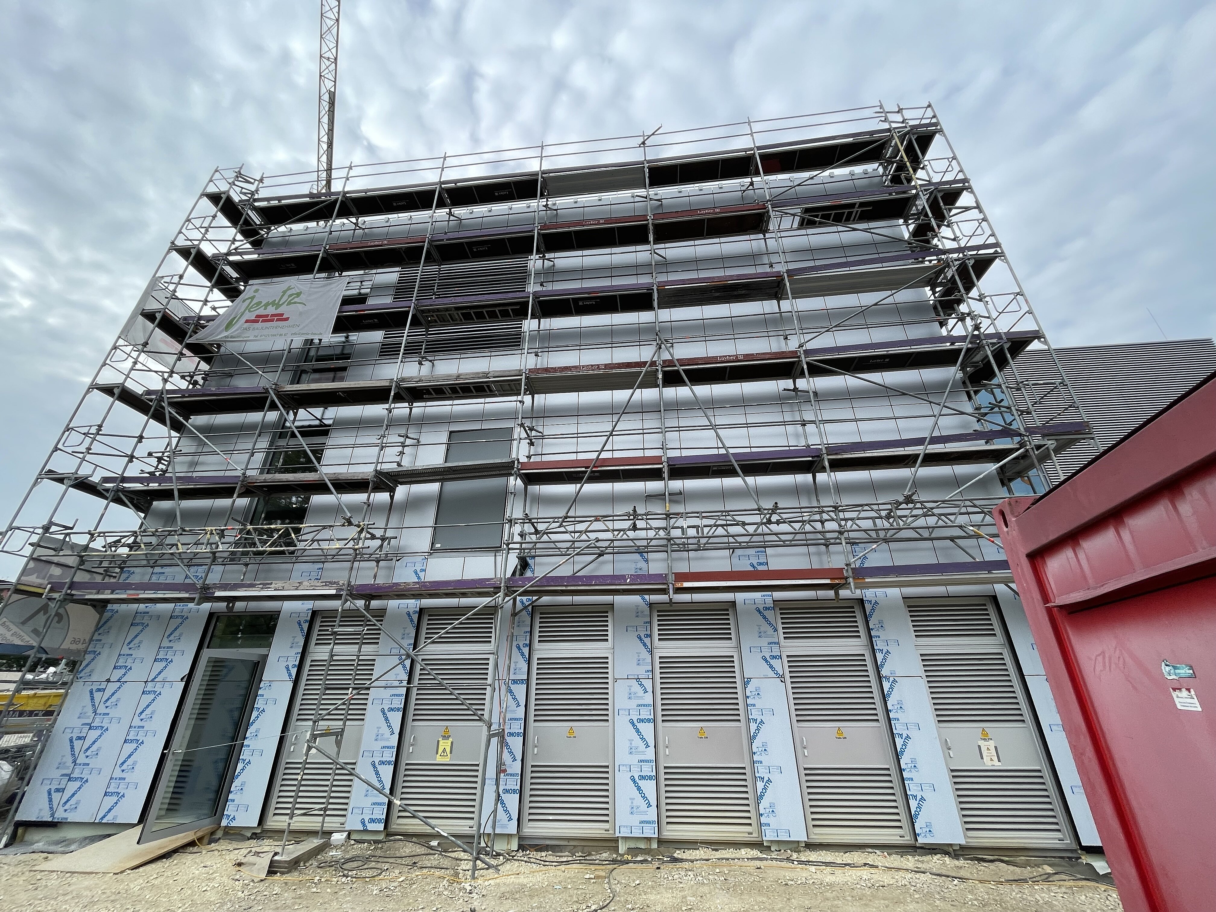 Die Fassade erhält mit einer vorgehängten Alu-Cubond Fassade, die eine identische Materialität und Farbigkeit wie das Bestandsgebäude erzeugt und so ein einheitliches Gesamtbild entsteht.